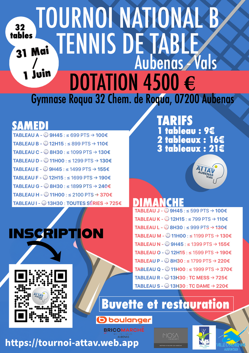 Tournoi national B sur 32 TABLES, DOTATION 4500€