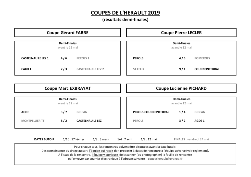 Après les résultats des demi-finales (en pièce jointe), le programme des finales des Coupes de l'Hérault 2019 est maintenant connu.