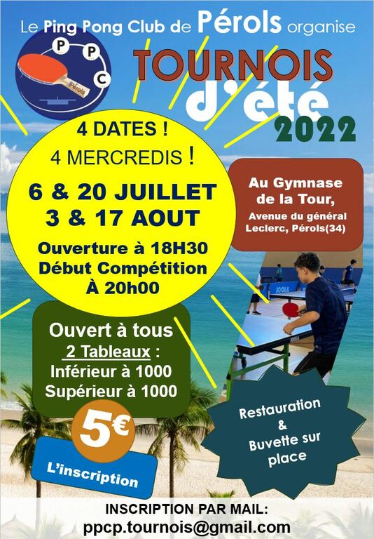 Les tournois d'été du club de Pérols sont de retour, venez jouer au Gymnase de la tour, à Pérols, 4 mercredis soir de l'été :